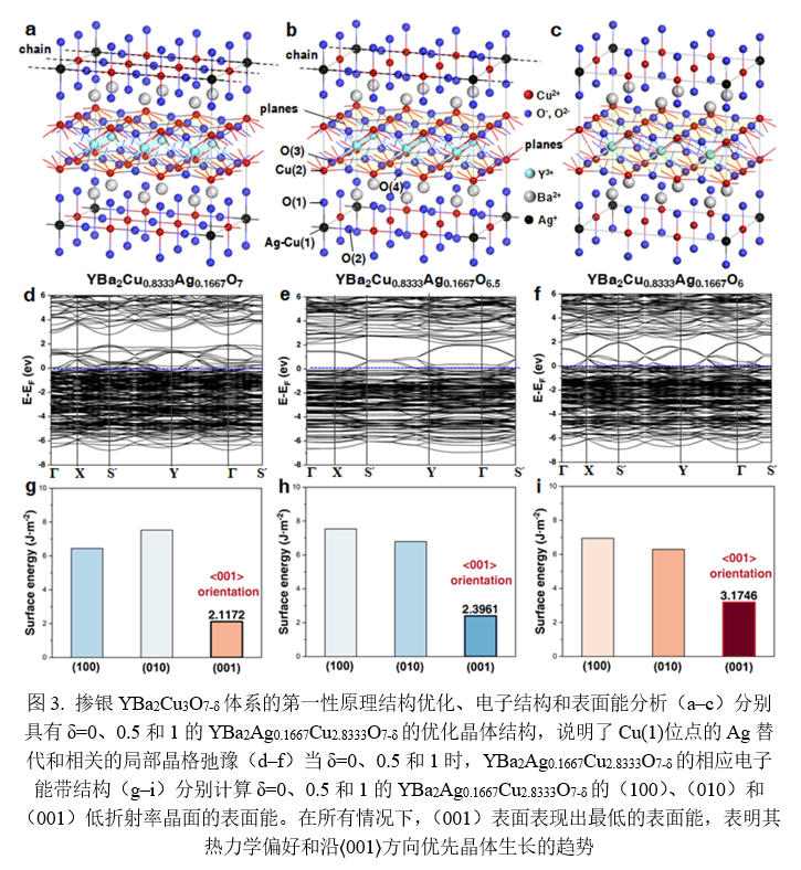 随后,他们通过第一性原理计算进一步揭示了这一取代行为对晶体结构演化的内在驱动力。如图3所示,计算结果表明,Ag+取代Cu(1)位点后,Ag–O键的形成会显著改变局域配位环境,诱导晶格沿c轴方向发生各向异性的定向弛豫,使得[001]方向在能量上更有利于持续生长。这种由局域化学取代引发的结构弛豫,为实验中观察到的取向固溶相形成提供了清晰的物理依据。