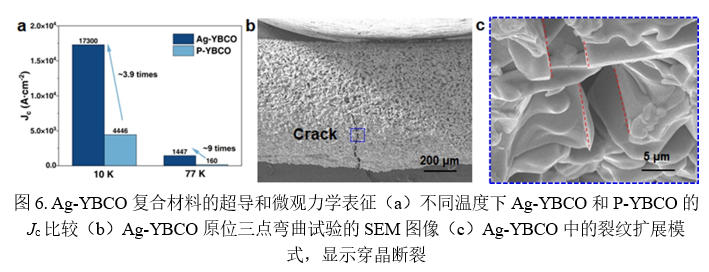 最后,他们发现这种织构取向效应与晶界桥接机制的协同作用,使得材料的临界电流密度得到显著提升,并促使裂纹扩展机制由传统的沿晶断裂逐步向穿晶断裂转变,明显改善了块体YBCO超导材料的力学韧性与整体结构完整性,如图6所示。总体而言,该研究从“固溶掺杂—晶格弛豫—共格界面—织构传递”这一完整演化链条出发,系统揭示了一种由局域化学取代驱动宏观织构演化的新机制,不仅深化了对Ag掺杂YBCO作用本质的认识,也为多相REBCO超导材料中结构设计、织构调控与性能协同优化提供了具有启发意义的新思路。