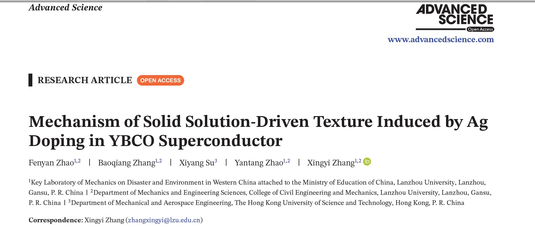 上述研究成果以 “Mechanism of Solid Solution‐Driven Texture Induced by Ag Doping in YBCO Superconductor” 为题,发表在国际知名期刊《Advanced Science》上。兰州大学博士生赵芬妍与张宝强讲师为论文共同第一作者,张兴义教授为通讯作者,萃英博士后苏西洋和博士生赵艳堂为论文的其他作者。该研究得到了国家重点研发计划项目(No.2024YFB4607300)、国家杰青(No.12325205)、面上项目(No.12572206)、兰州市杰出人才研究基金(No.127000-563225112)和甘肃省科技领军人才项目(No.24RCKB008)的联合资助。