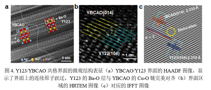 针对上述难题,兰州大学张兴义教授团队在近年实现的超导材料3D打印可控制备工艺(AFM, 2021)基础上提出了一种双材料共挤结合冷冻铸造的结构化制备策略,在YBCO–Ag体系中构建了同时具有宏观材料界面与定向孔隙通道的复合结构,如图1所示。该策略通过在成形阶段引入可设计的空间结构,为后续热处理过程中掺杂元素的扩散路径和反应行为提供了明确的几何约束,从而突破了传统粉体混合掺杂中成分均匀、过程不可追踪的局限。研究发现,在随后的高温烧结与退火过程中,Ag+离子优先沿冷冻铸造形成的定向孔道发生快速扩散,在材料内部形成由界面向基体逐渐衰减的浓度梯度。其中,一部分Ag+能够进一步进入YBCO超导晶粒(Y123)内部,选择性取代Cu–O链中的Cu(1)位点,形成具有明确晶体取向特征的Ag掺杂固溶相。原子尺度表征结果直接证实了Ag的取代行为及其在晶格中的稳定存在,而非仅以晶界沉淀或第二相的形式存在,如图2所示。