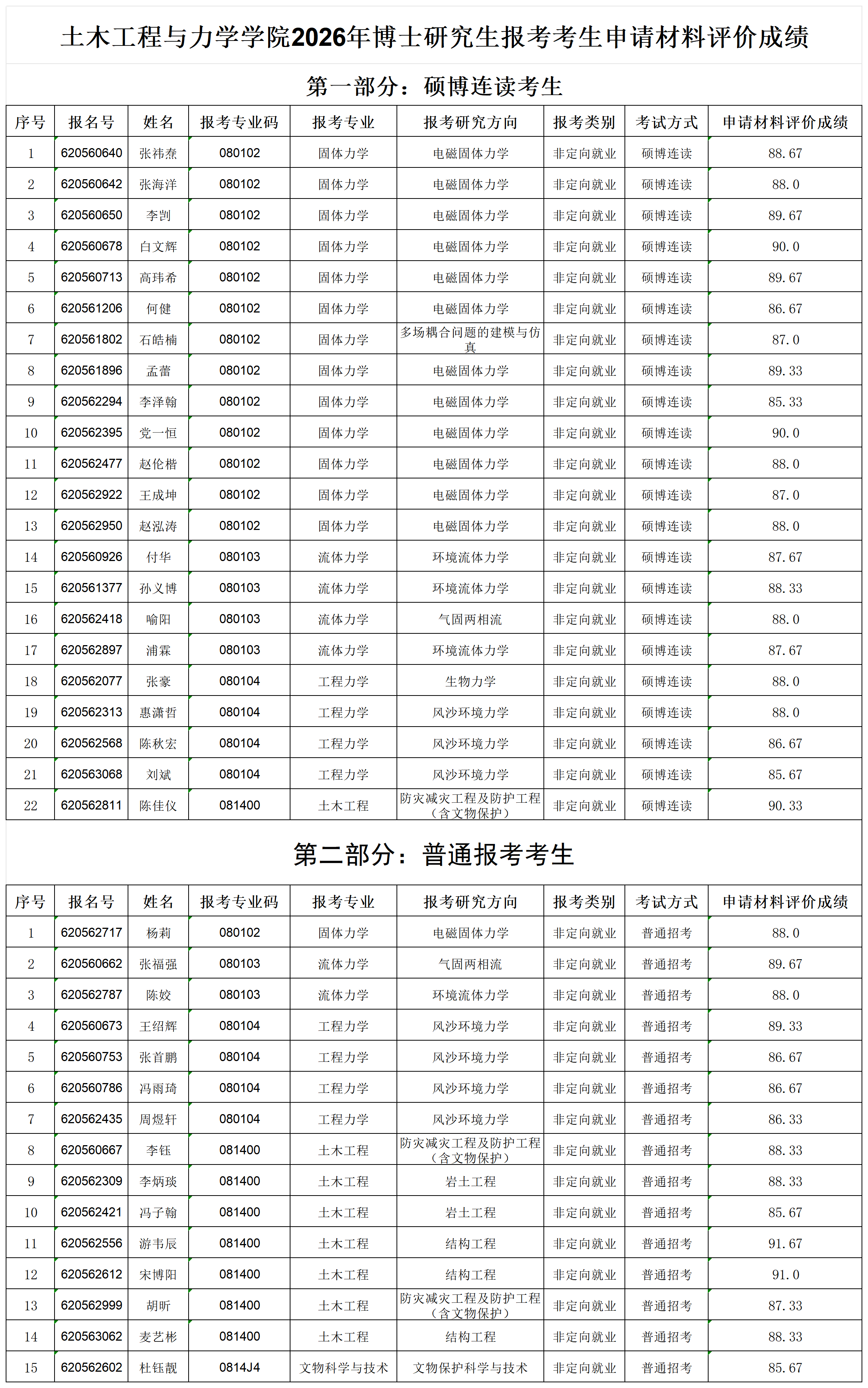 土木工程与力学学院2026年博士研究生报考考生申请材料评价成绩公示