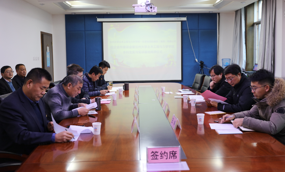 为充分深化产教融合、加强校企合作,2021年12月31日,兰州大学土木工程与力学学院与甘肃民航建设(集团)有限公司举行本科生实习实训基地揭牌仪式暨校企合作座谈会。学院院长黄宁教授,地质工程系主任张景科教授,学院办公室主任王水存,甘肃省民航机场集团财务总监乔松青,甘肃民航建设集团党委书记、董事长骆首峰,建设集团党委副书记、职工董事、纪委书记、工会主席田润宇,建设集团党委委员、副总经理张得文,建设集团党委委员、总工程师王佟,建设集团财务总监张德升等参加了座谈。